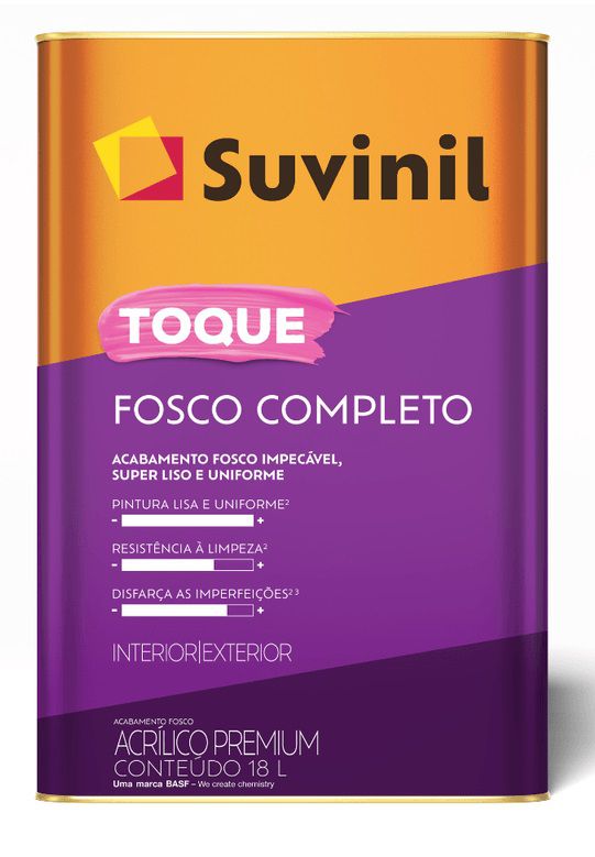 A tinta Suvinil Toque Fosco Completo é perfeita para você ter um acabamento fosco impecável, superliso e uniforme nas paredes internas de casa. Na escala de benefícios, ela entrega máxima performance em pintura lisa e uniforme, além de boa resistência à limpeza e maior disfarce de imperfeições em comparação com a Suvinil Toque Seda e a Suvinil Toque Brilho.