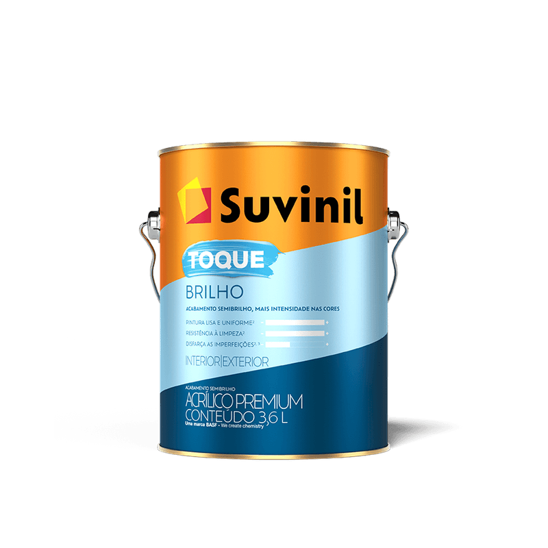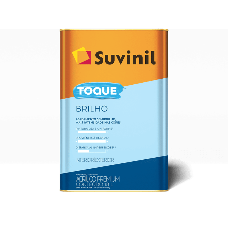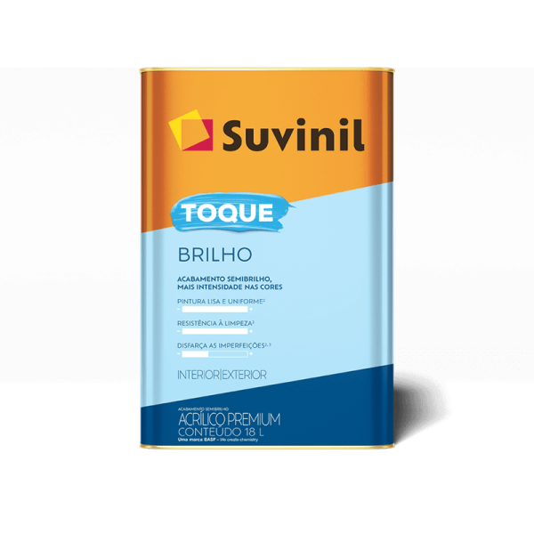 A tinta Suvinil Toque Brilho oferece acabamento semibrilho que intensifica as cores. Na escala de benefícios, ela entrega máximo desempenho em pintura lisa e uniforme, assim como em resistência à limpeza.
